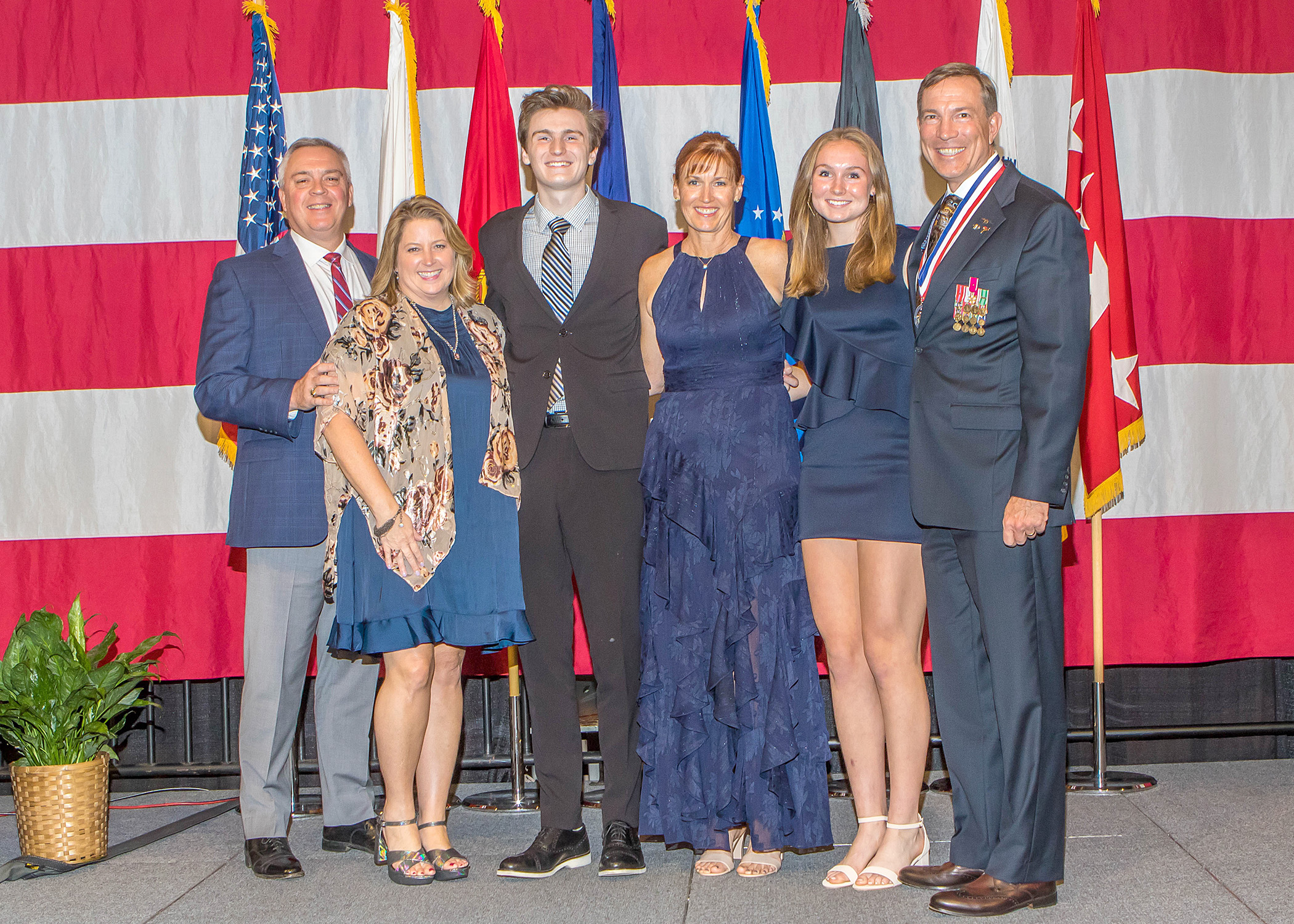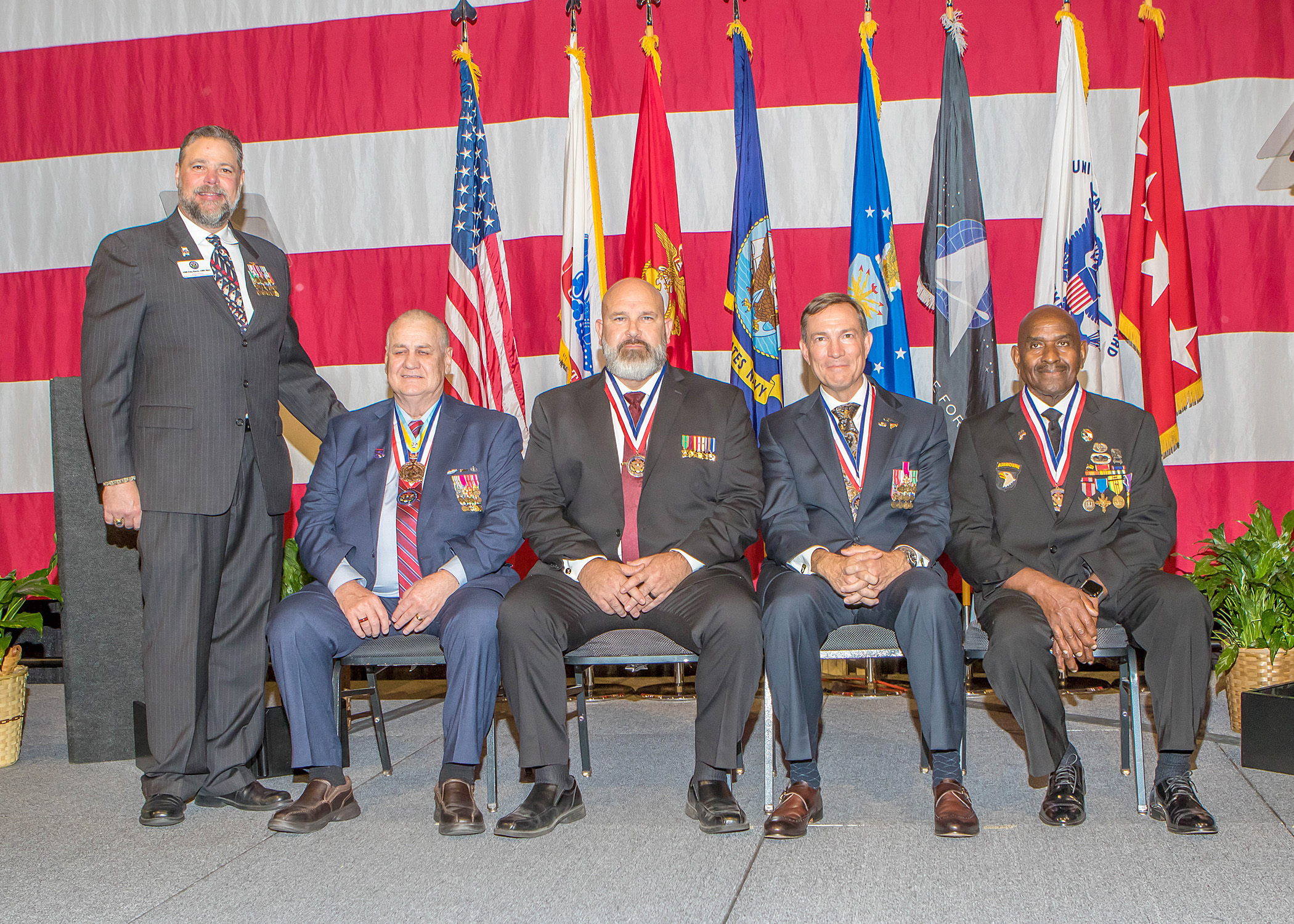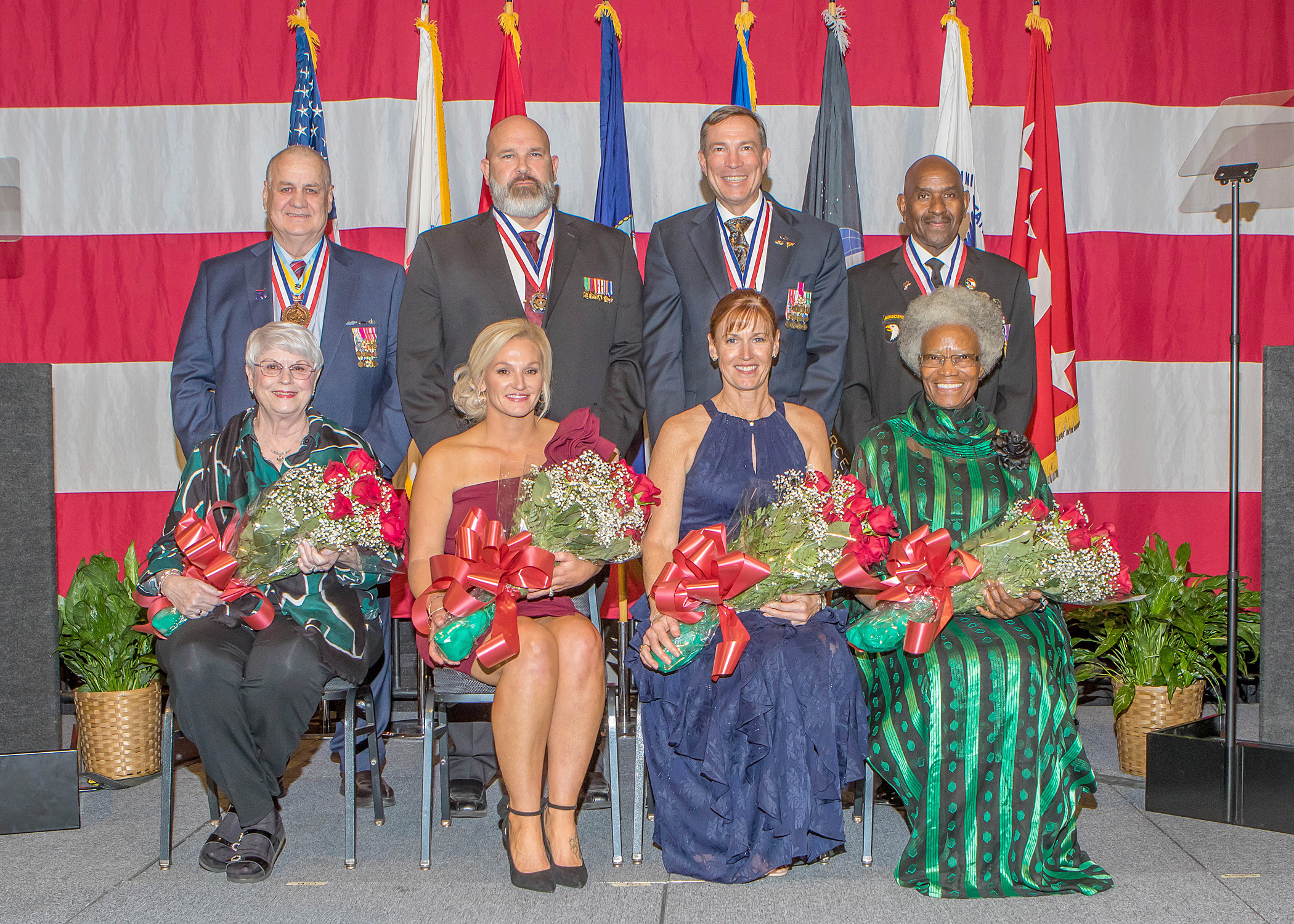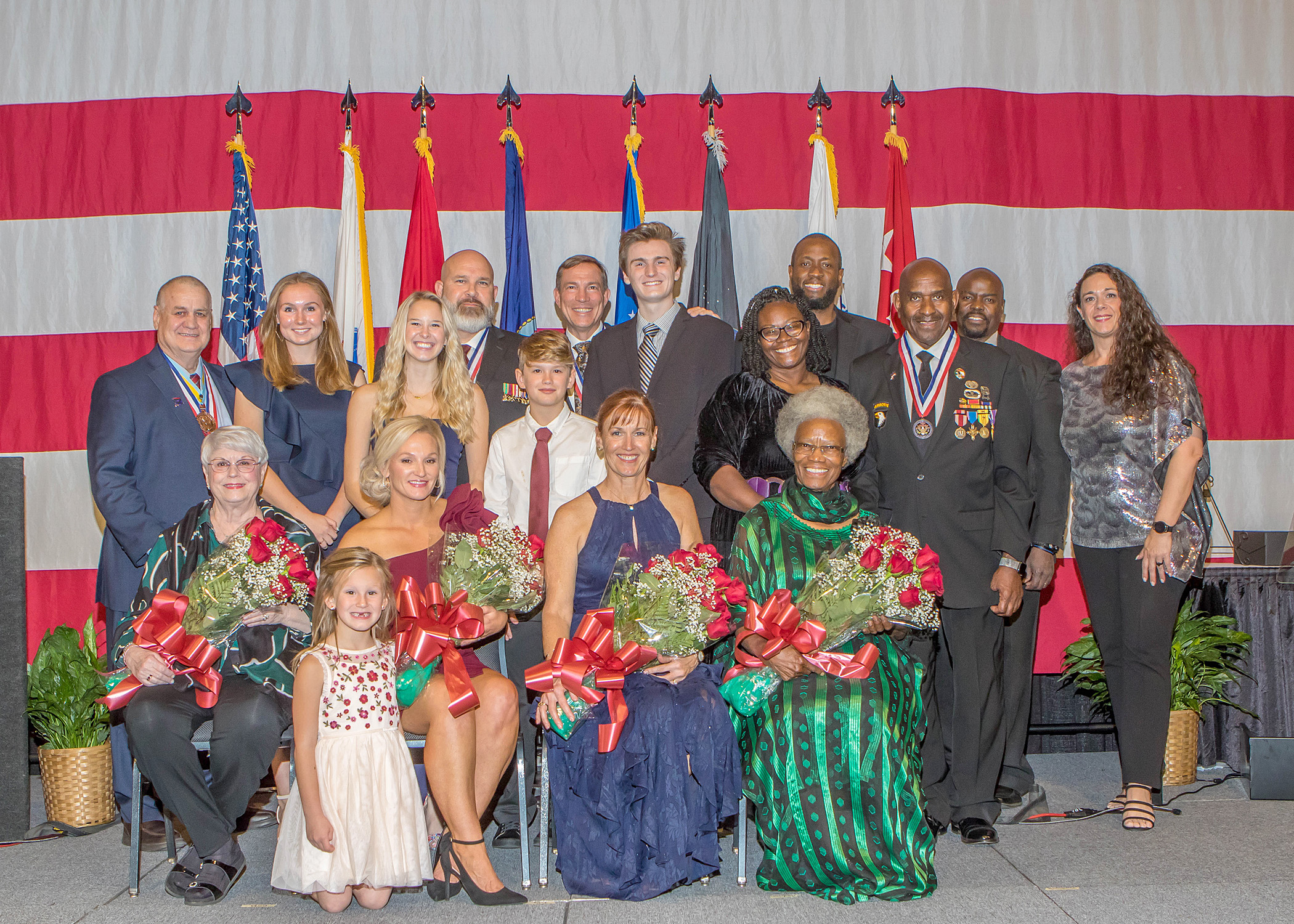 The 2022 Hall of Heroes inductees, ordered from left to right: Mrs. Bowling (Accepting for MG Melvin Bowling) Mrs. Perry (Accepting for 1SG Donald Perry) BG Robert Stewart SGT Justin Pelto