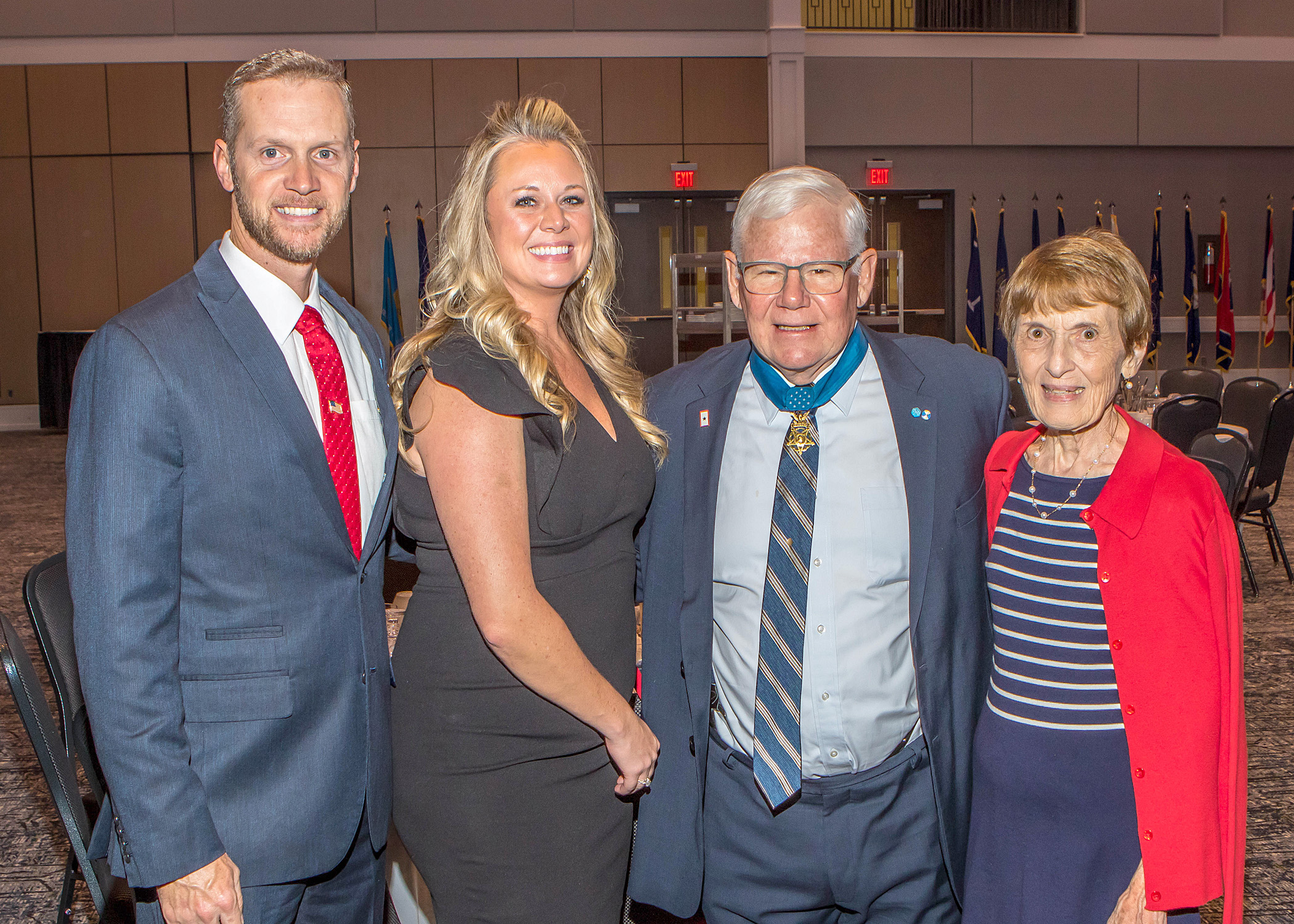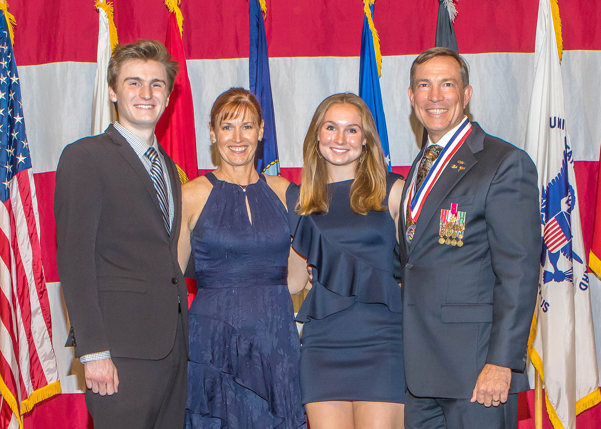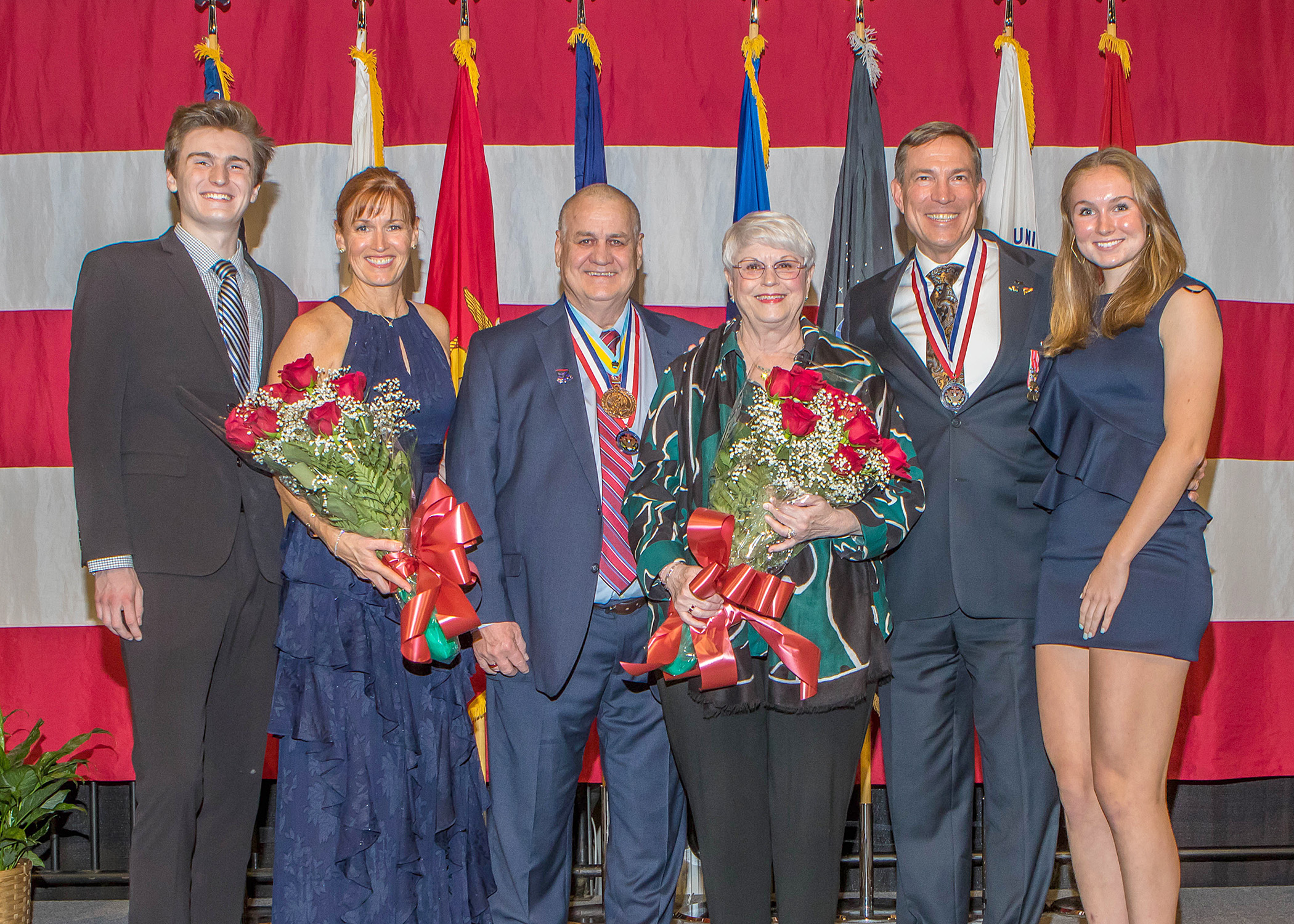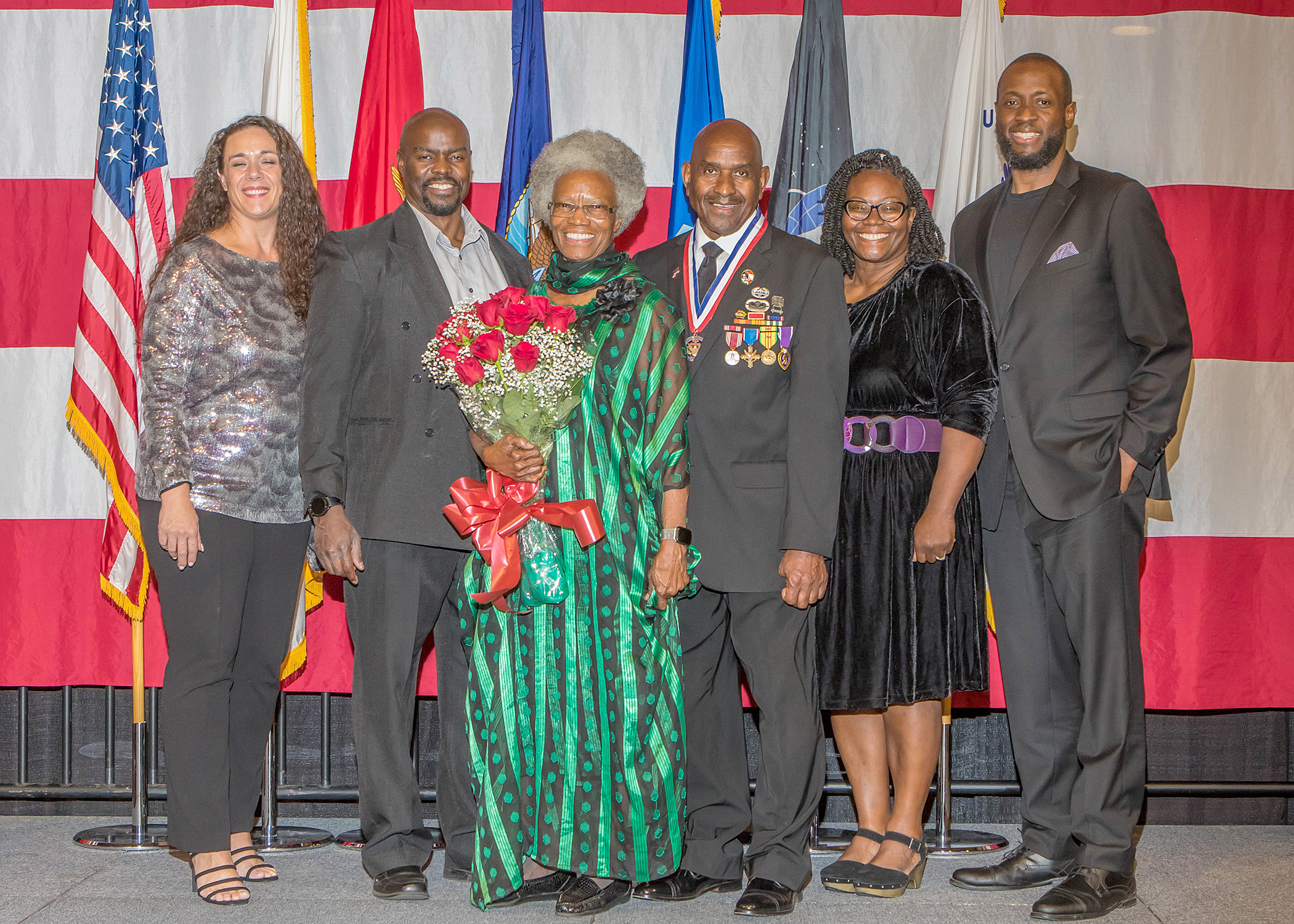 The 2022 Hall of Heroes inductees, ordered from left to right: Mrs. Bowling (Accepting for MG Melvin Bowling) Mrs. Perry (Accepting for 1SG Donald Perry) BG Robert Stewart SGT Justin Pelto